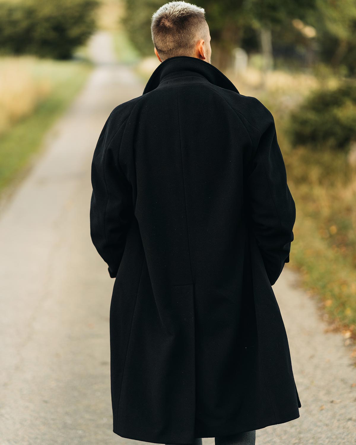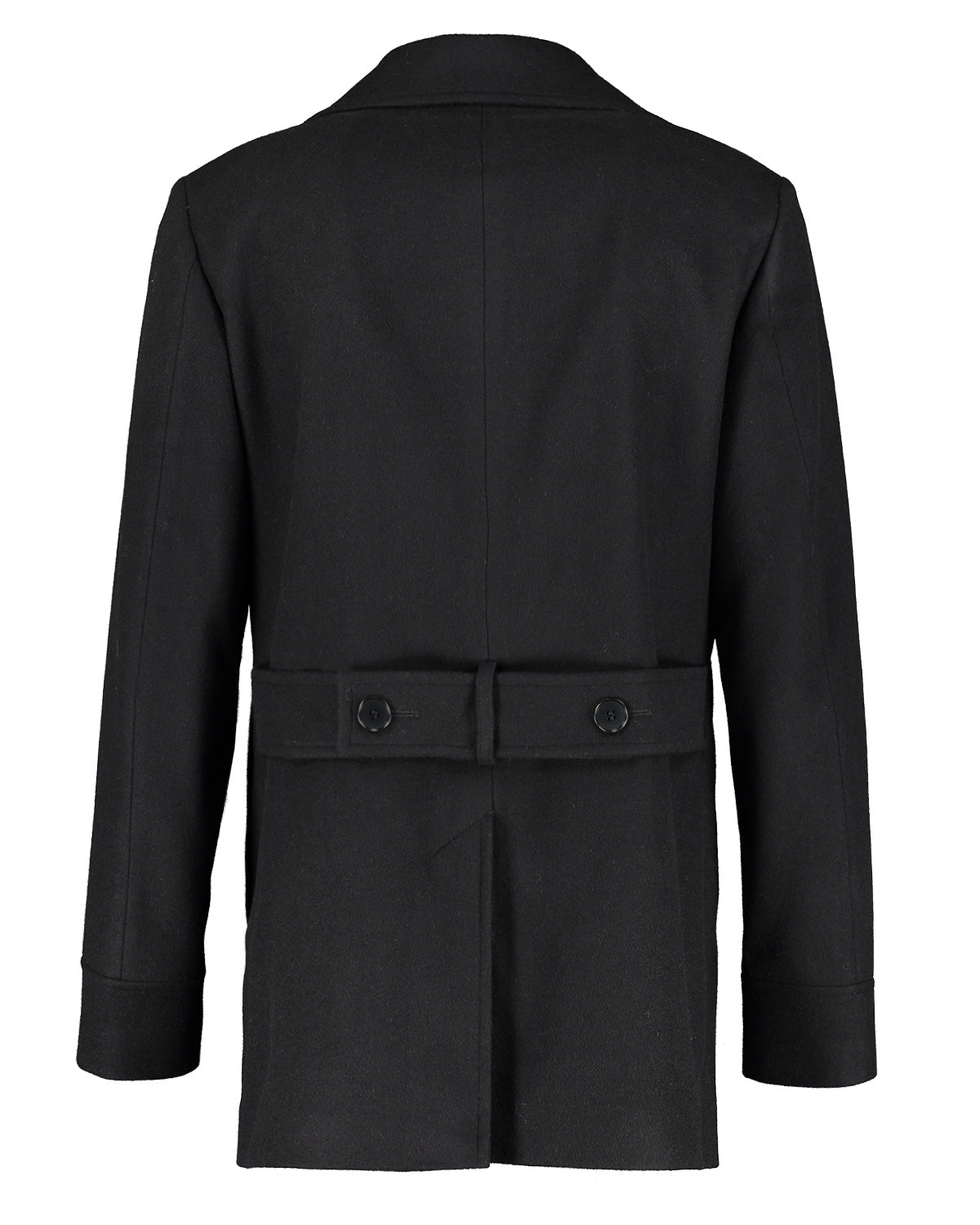 Black double breasted overcoat on a white background