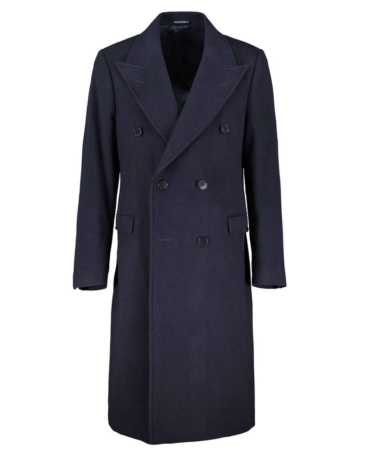 Navy blue double breasted overcoat on a white background.